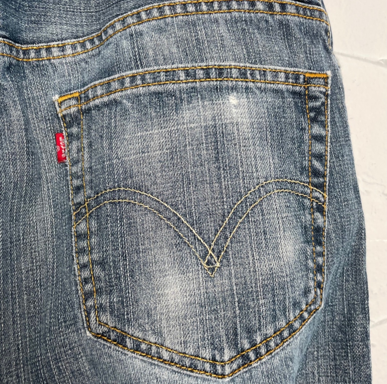右足(画像6枚目)、背面右ポケット(画像10枚目)に布地の綻びが見られます。