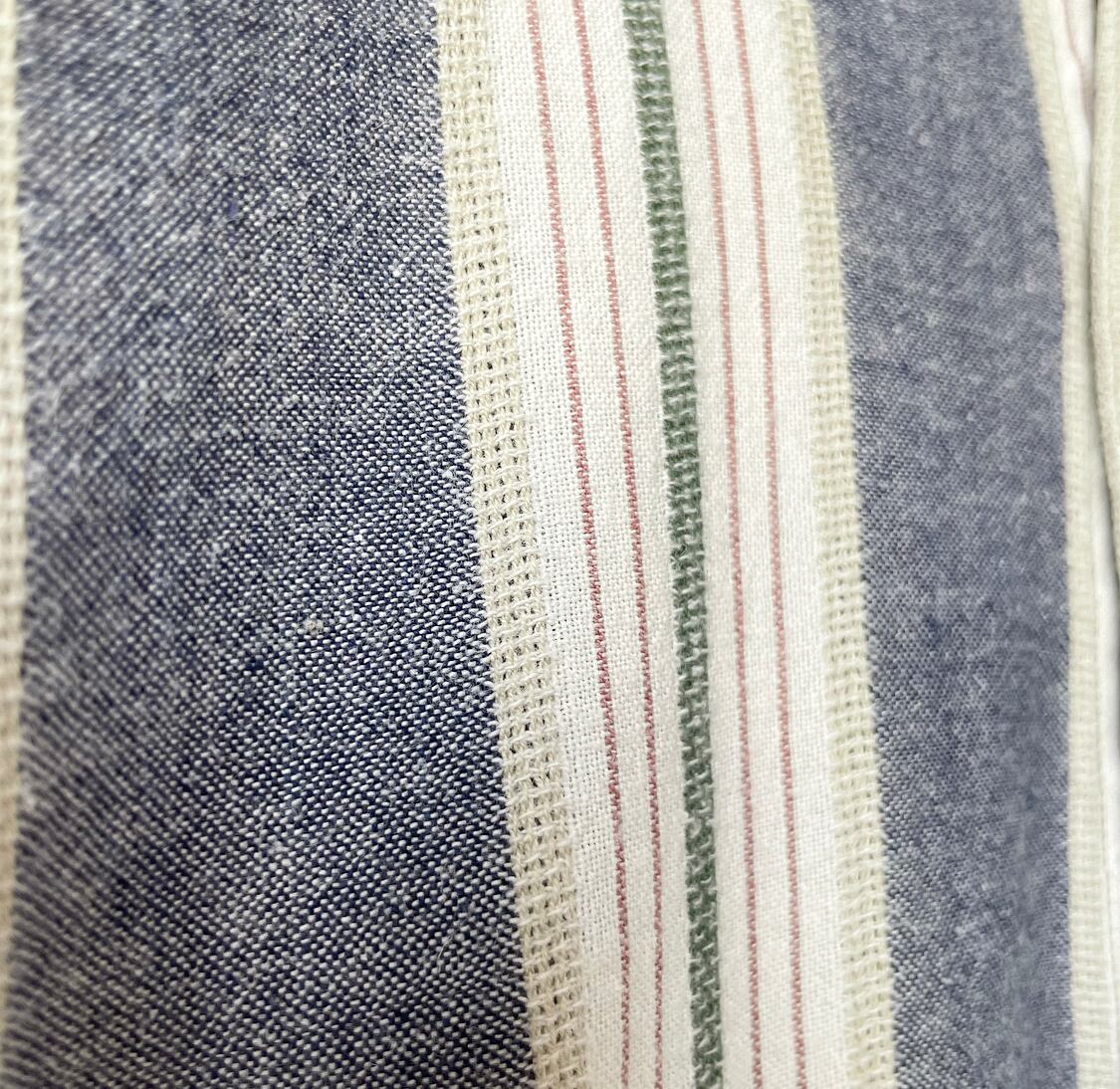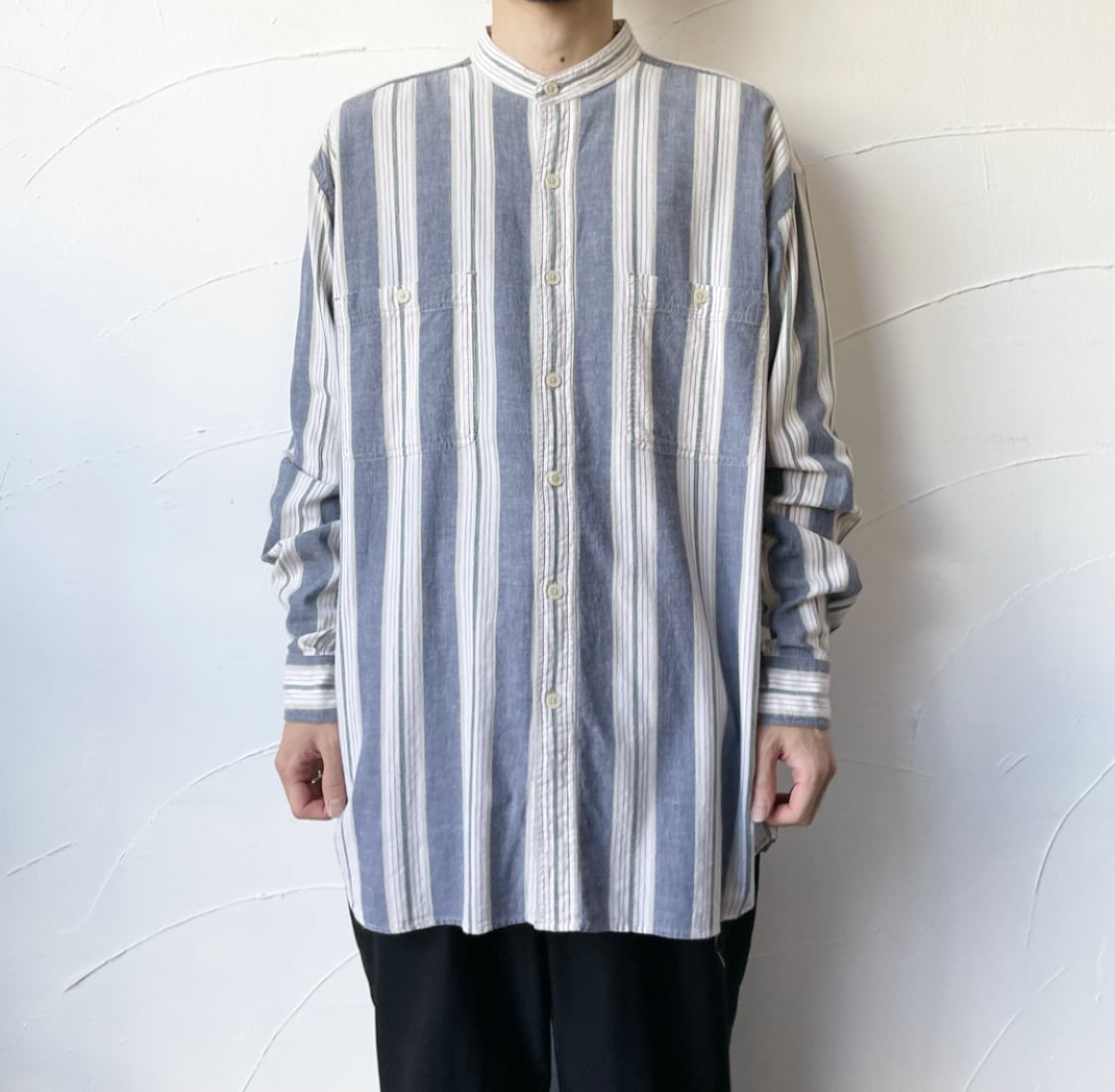 オフホワイトとデニムのようなブルーのストライプ柄のバンドカラーシャツ。