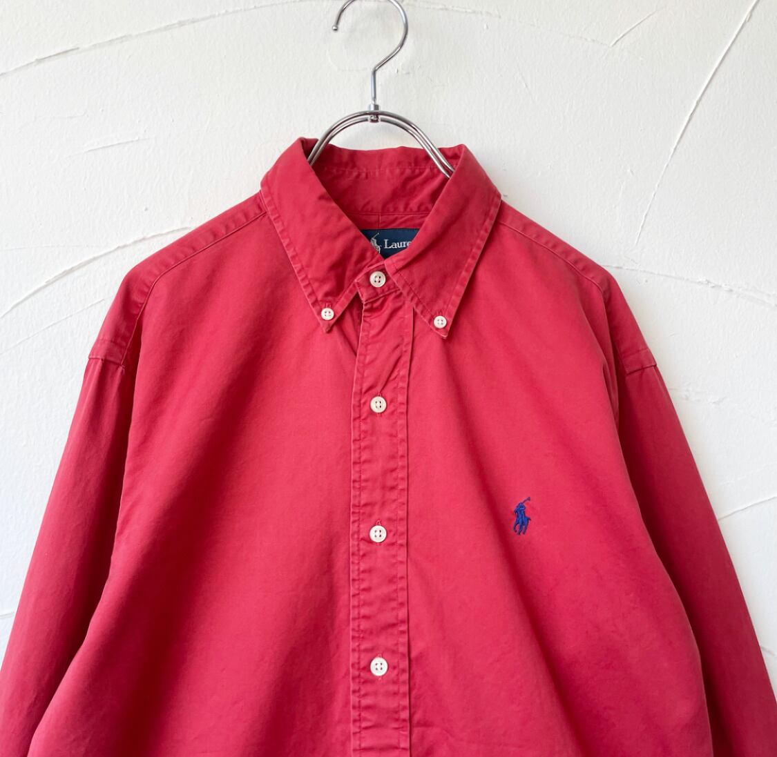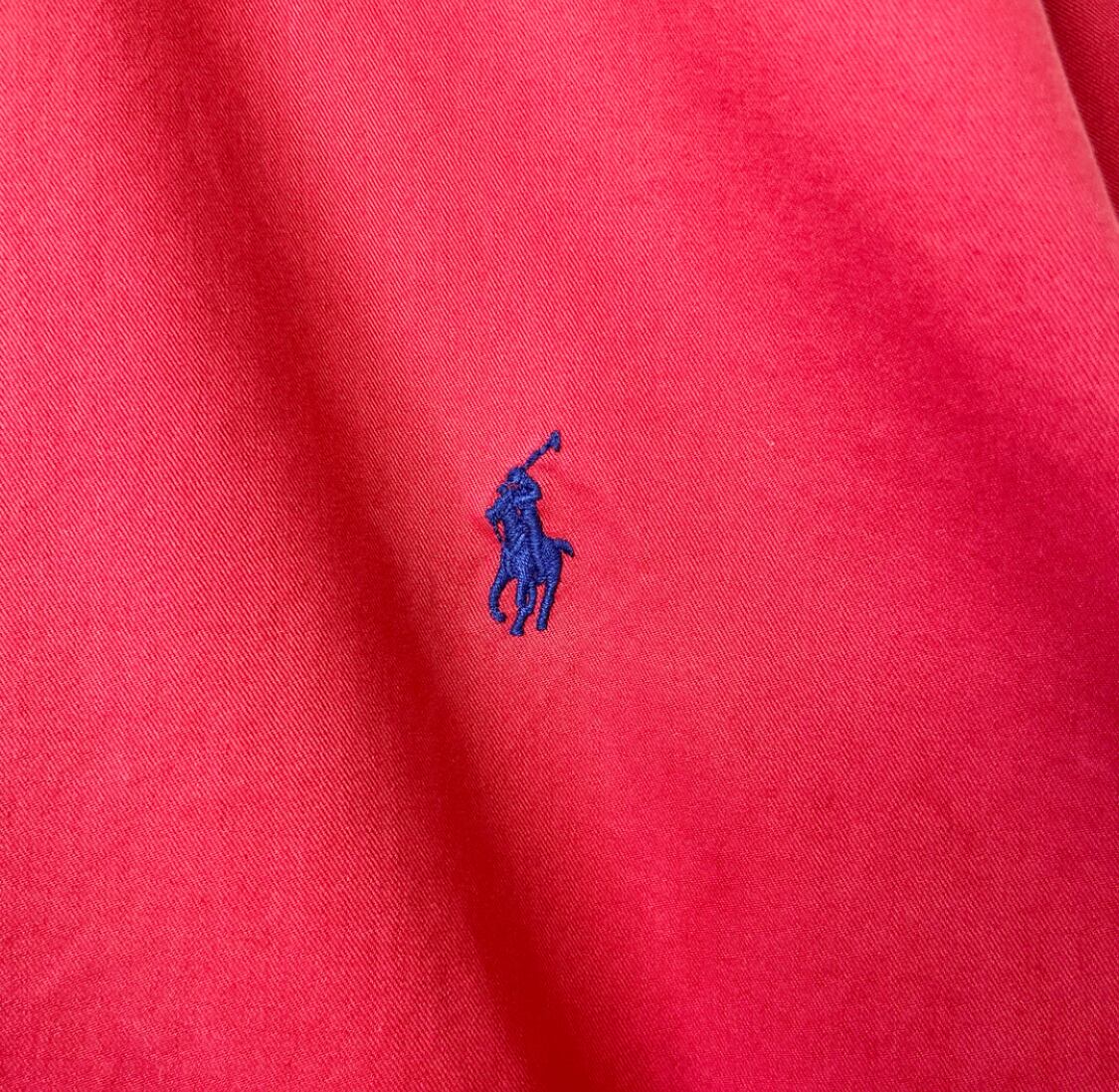 色あせた風合いのレッドカラーのラルフローレンボタンダウンシャツ。