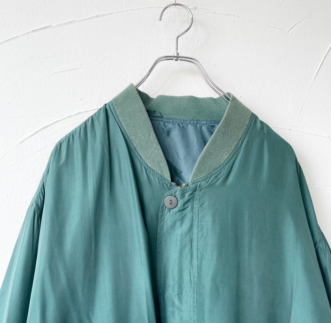 シルクブルゾンは海外古着の中でも定番的なアイテムの1つですが、フロントがジップの隠れる比翼タイプになっているのが珍しいポイントです。