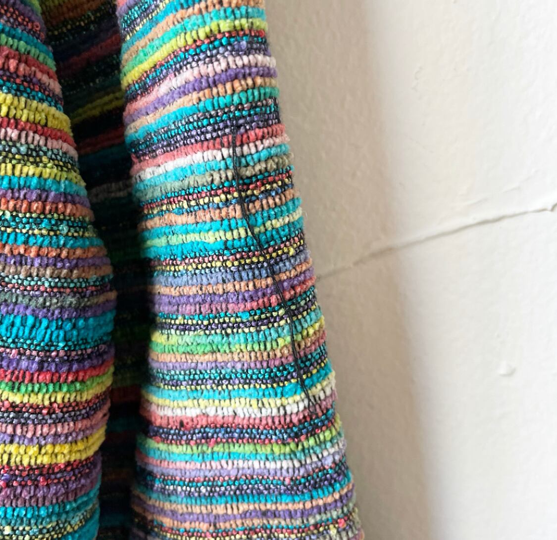 カラフルな糸で織られたテキスタイルがさをり織りのようなジャケット。