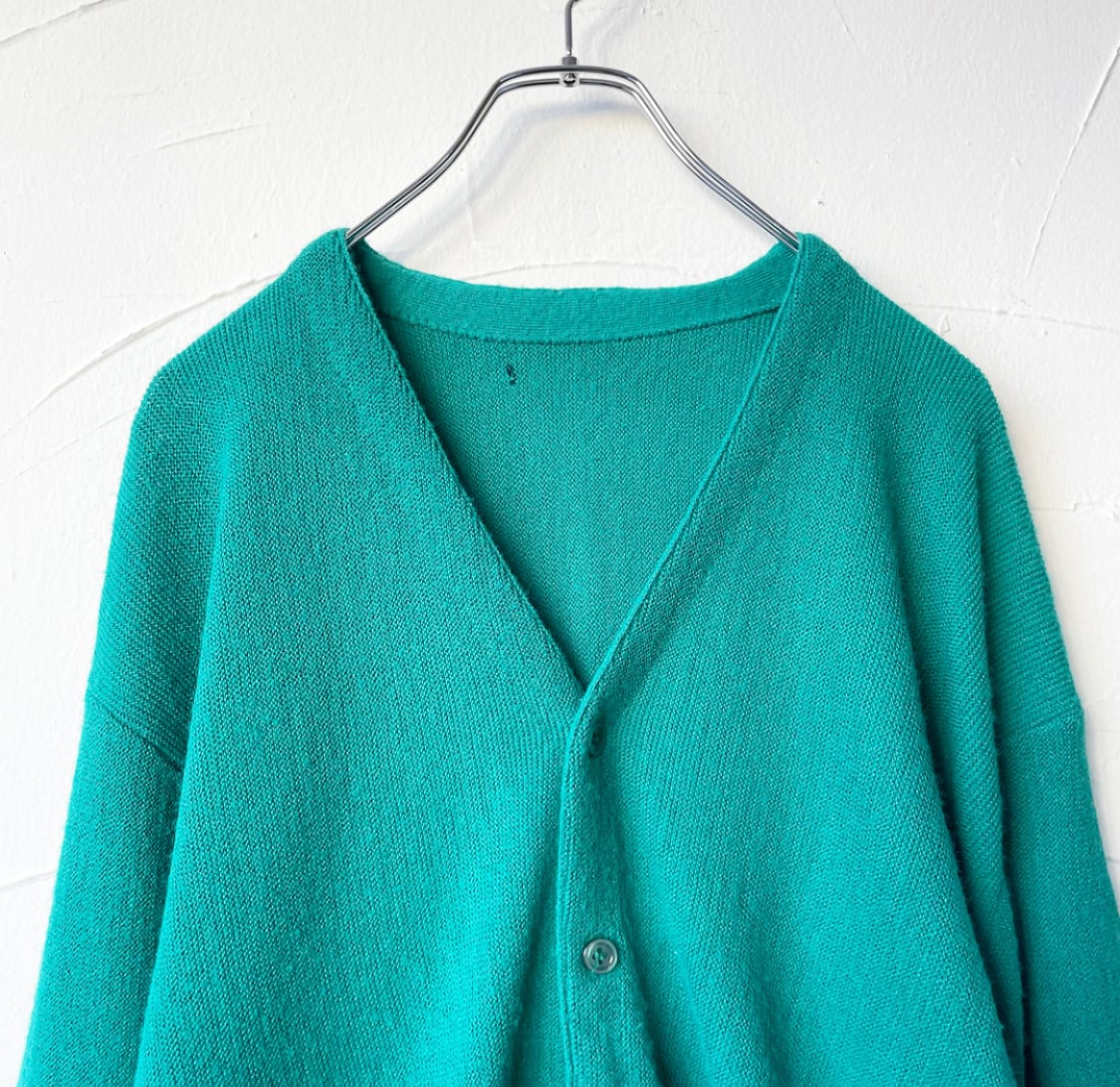 ブランドタグ・成分表示などがないため詳細は不明ですが、アクリルのような生地感のニットカーディガンです。