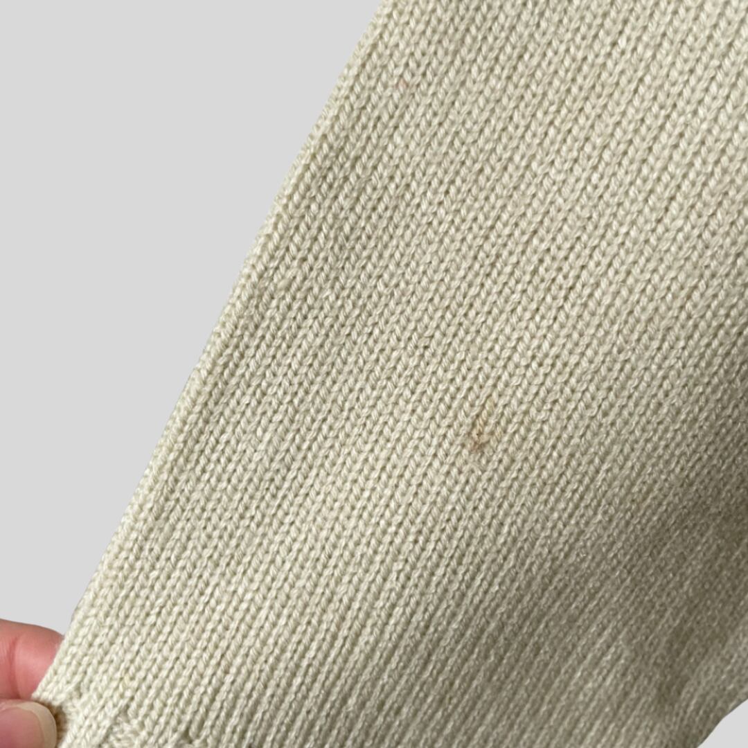 正面向かって左袖(画像4枚目)、右下のひし形(画像6枚目)に汚れが見られます。