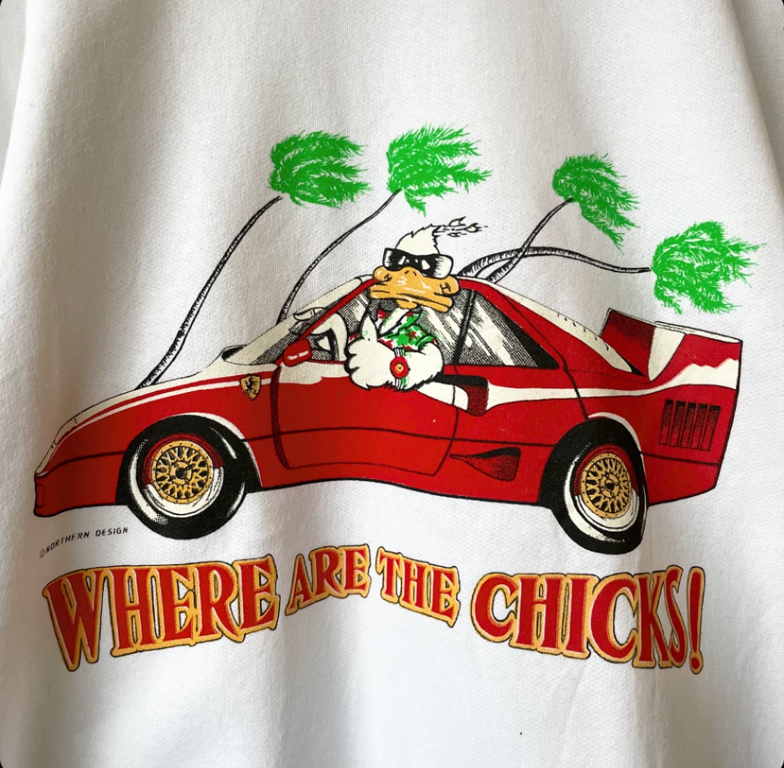 フェラーリを模したスポーツカーに乗ったアヒルがユニークなプリントです。