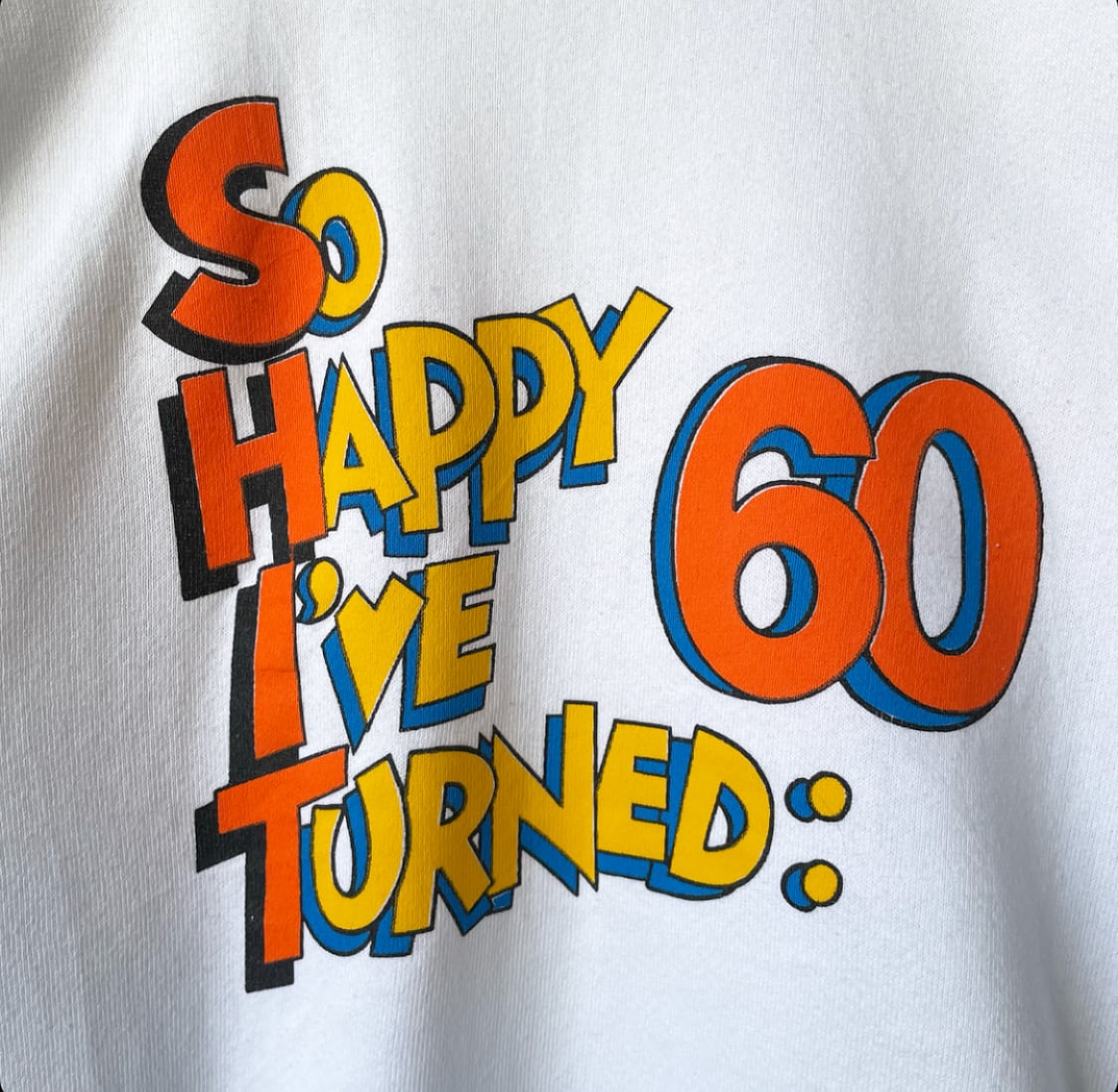 「60歳になって幸せ」の文言とスラングである「SHIT」が掛け合わされたユニークなロゴです。