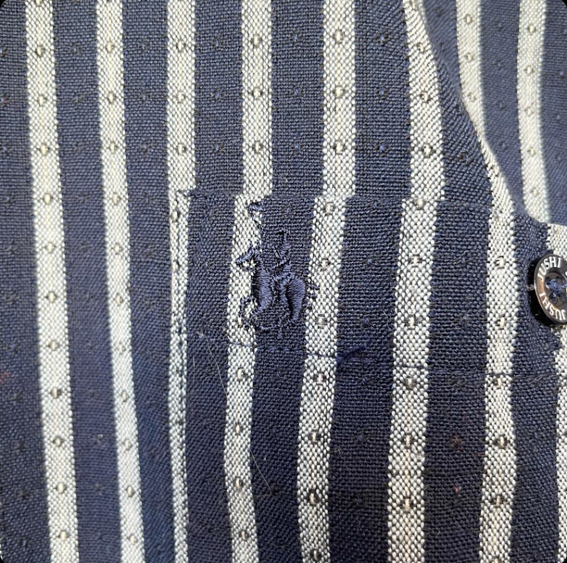 ネイビー基調のストライプ柄、織りで細かい柄が施されています。