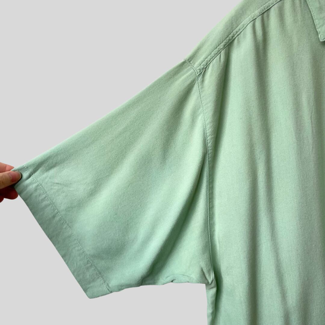 くすみグリーンのカラーとドレープ感のあるレーヨン素材が清涼感のあるシャツ。